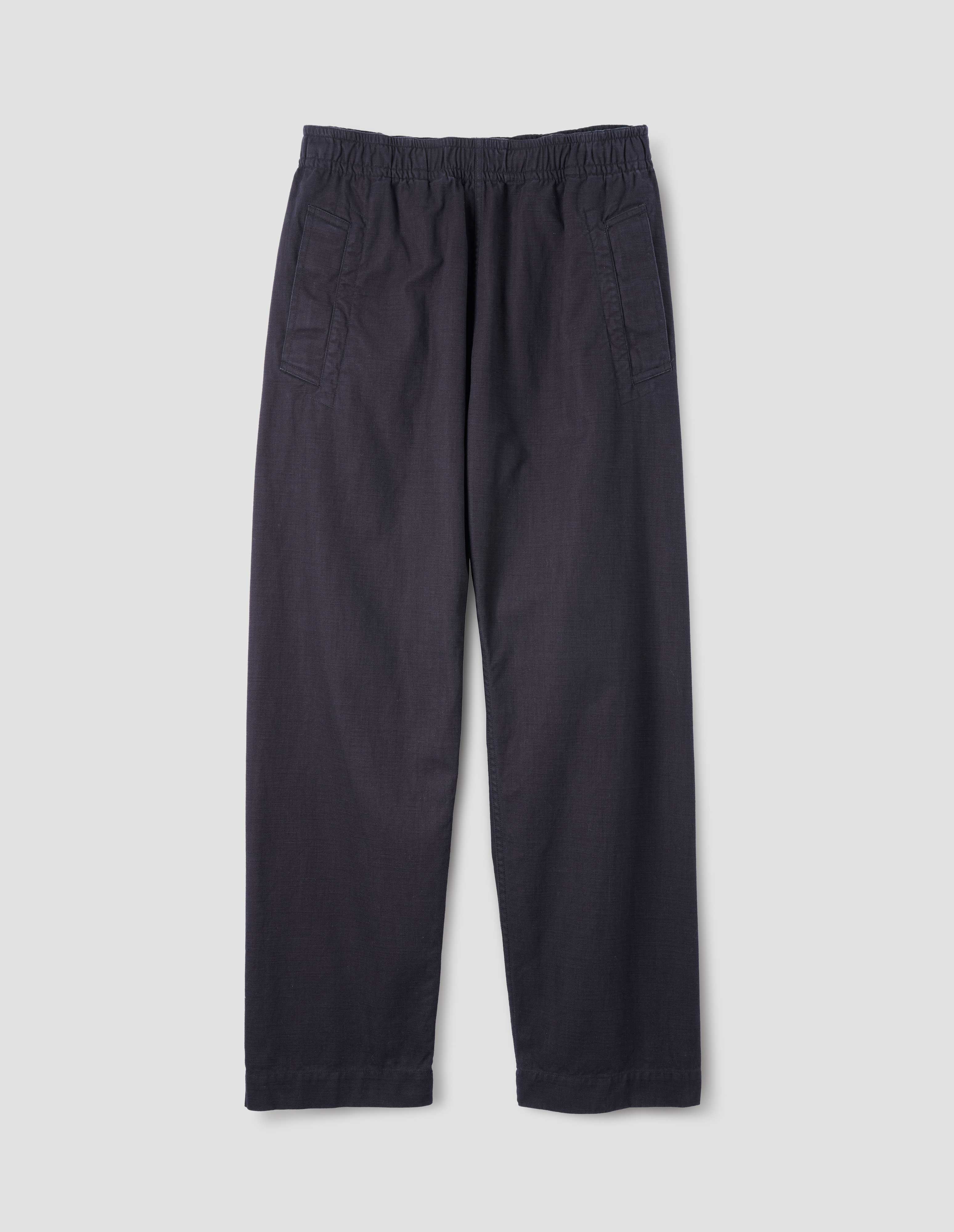 Cotton twill wide leg joggers. Relaxed cut. Elasticated waist with herringbone tape draw cord. Deep welt pockets. Patch back pocket with stitch-through detailing.
