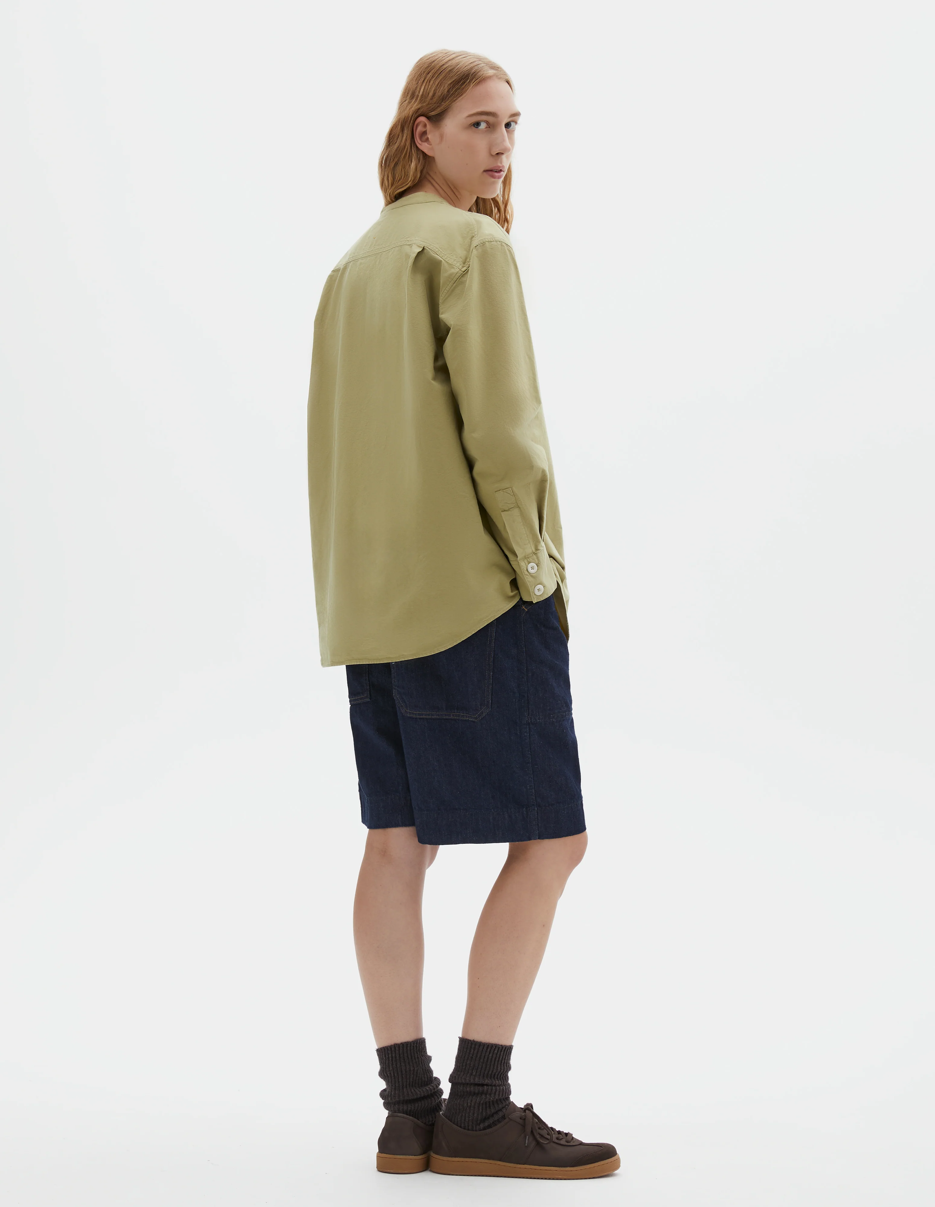 The MHL. Long Collarless Shirt has a relaxed cut and is fabricated in dense compact cotton canvas shirting with a soft, crisp hand feel. The shirt is constructed with a wide stitch-through placket, inset detailing on the shoulder, double button fastening cuffs, and pleats on the back yoke.