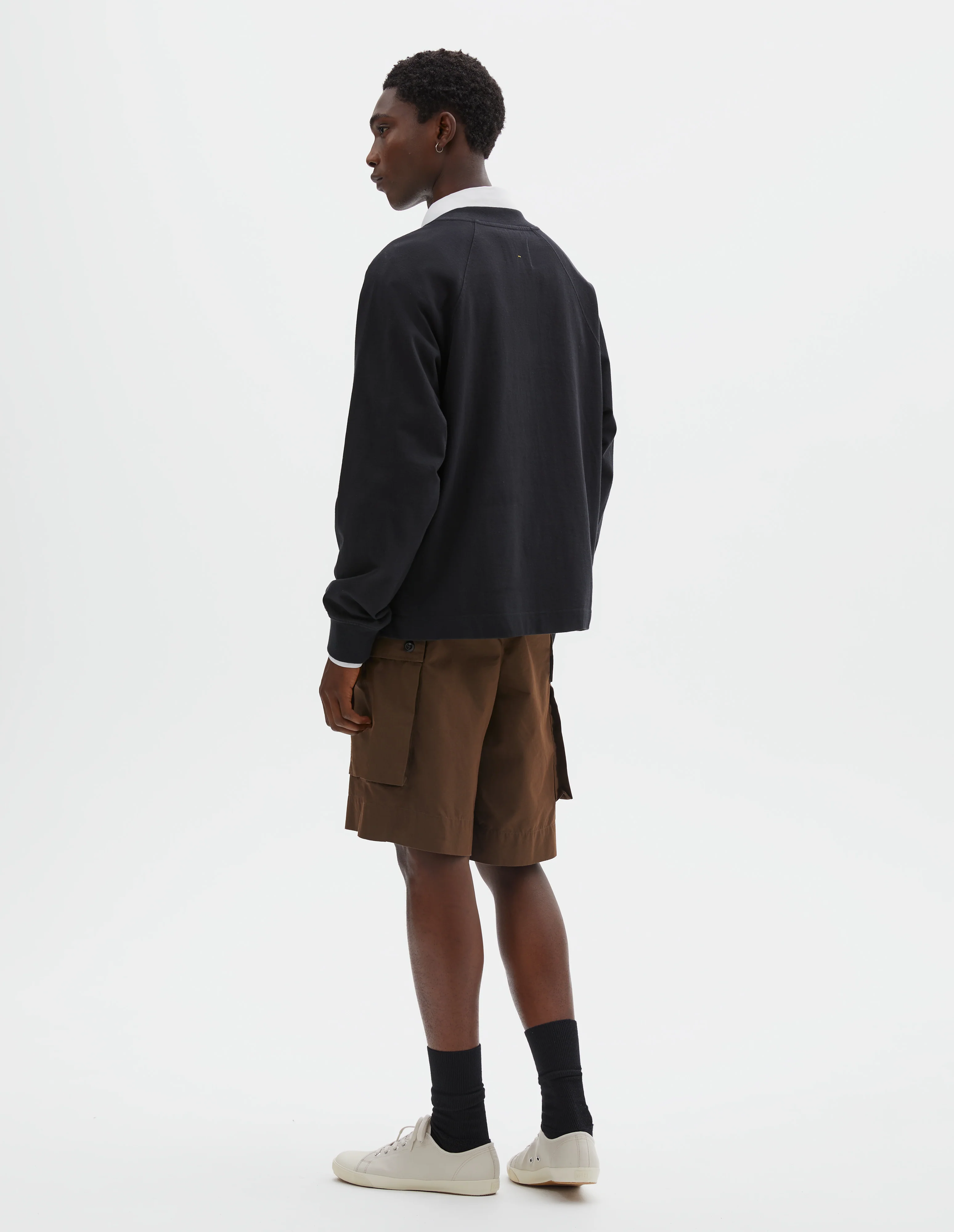 The MHL. Mock Neck T Shirt has a relaxed cut and is fabricated in cotton jersey with a dry hand feel. It is constructed with a raglan sleeve with twin needle stitch detailing, single rib trims on the neck and cuffs, and a vent split hem with herringbone tape detailing.