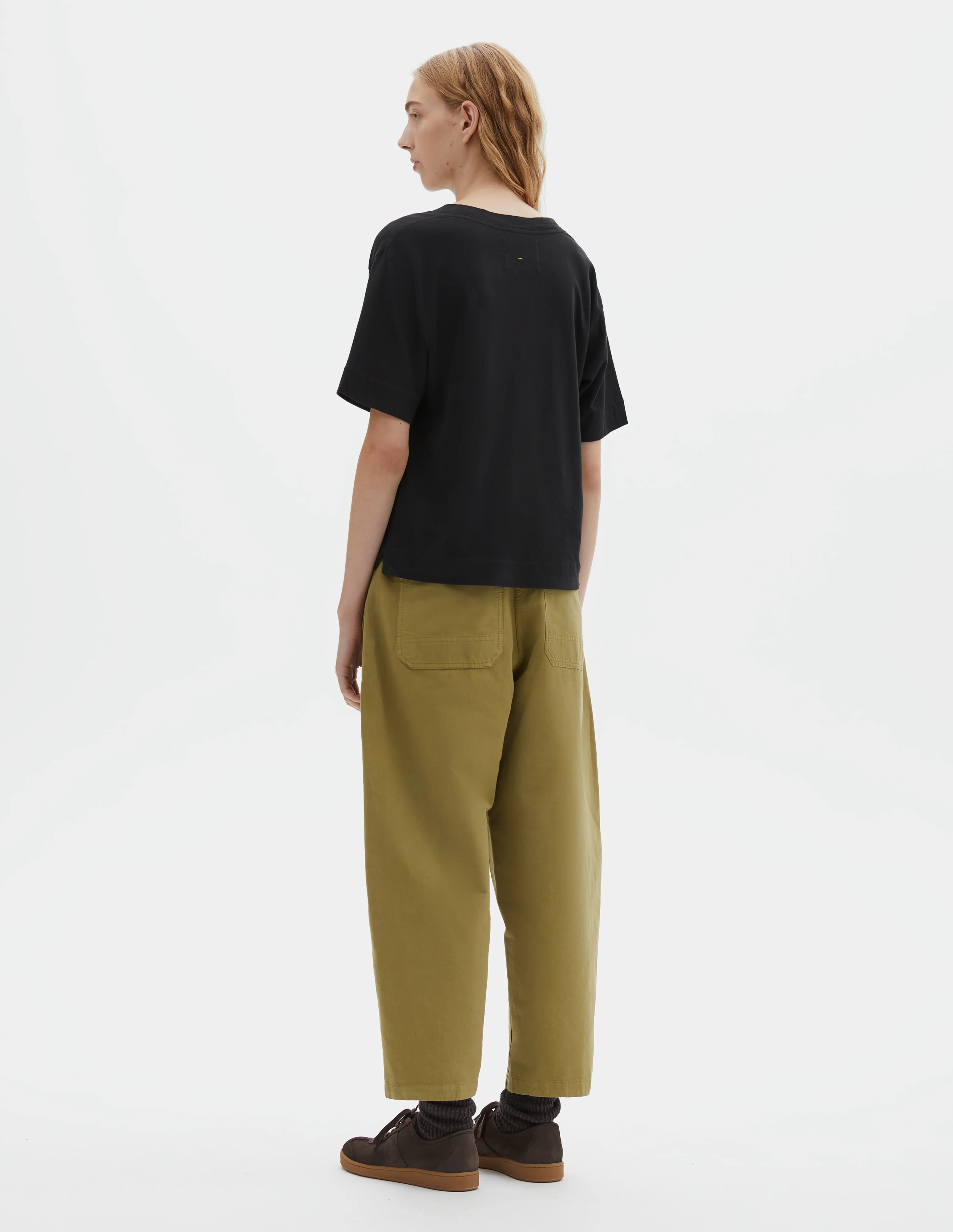 Lightweight cotton linen jersey simple T Shirt. Relaxed fit. Garment dyed. Contrast rib neck. Stitch detailing on back shoulder.